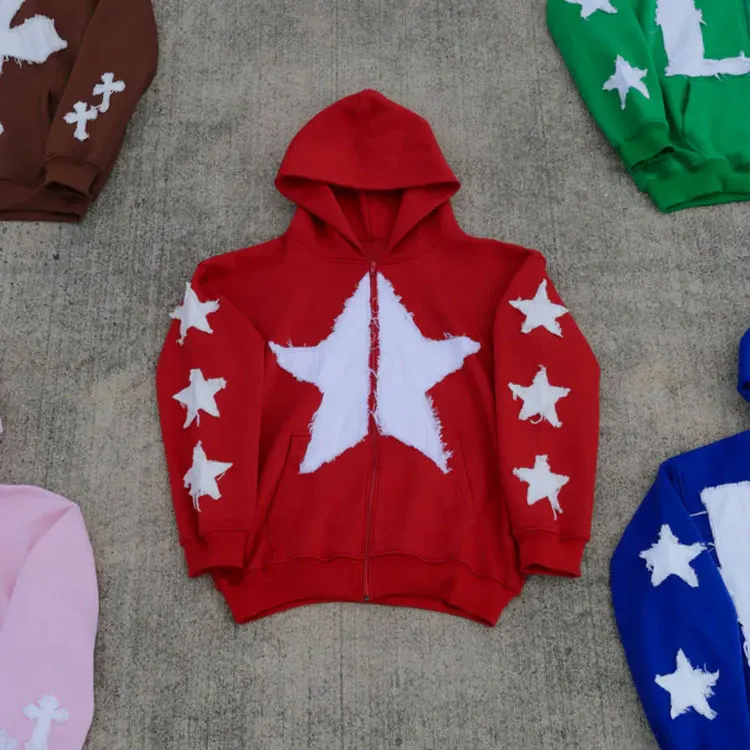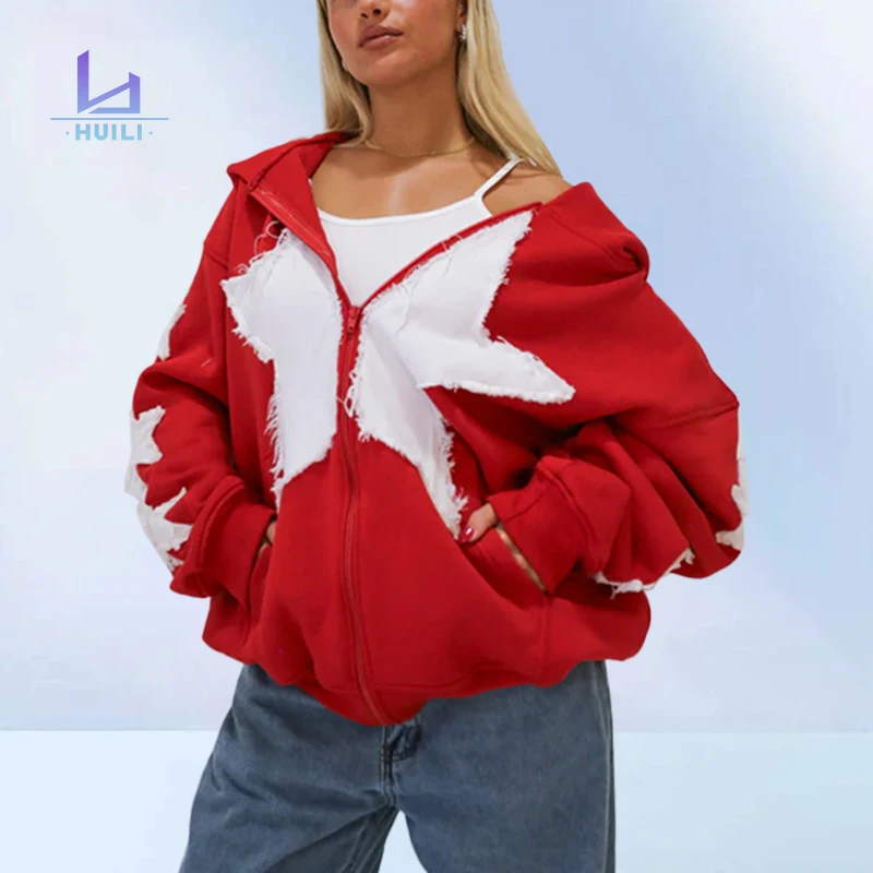 Huili Custom Logo Heavyweight Zip up Hooded Jacket Fall Winter Y2K Oversized Fleece Loose Fit Applique Embroidery Hoodie Women